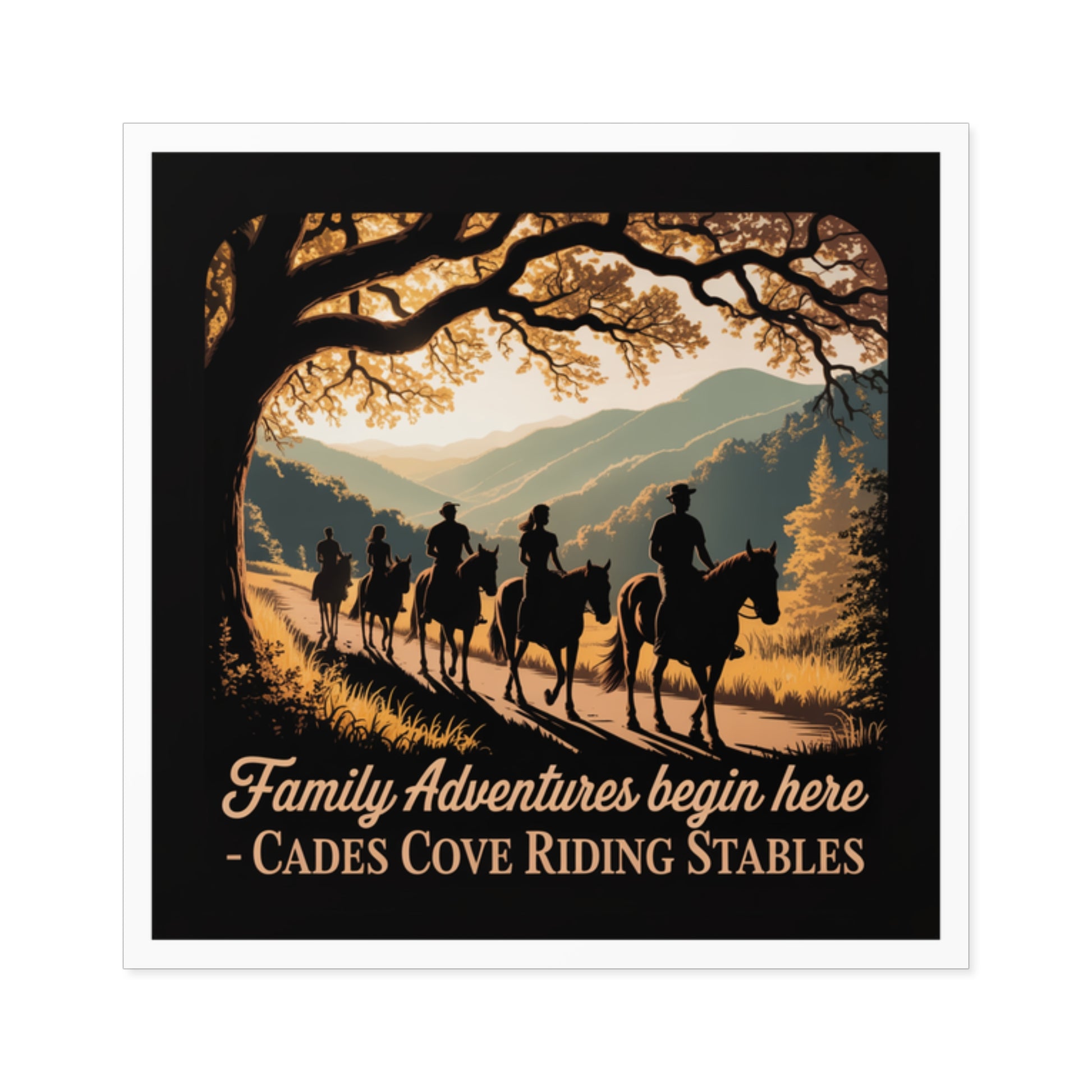 Bring home the spirit of the Smoky Mountains with our Family Adventures Begin Here sticker from Cades Cove Riding Stables. Featuring a scenic horseback ride design, this durable weatherproof decal is perfect for cars, water bottles, or travel gear. A beautiful reminder of your mountain adventure.