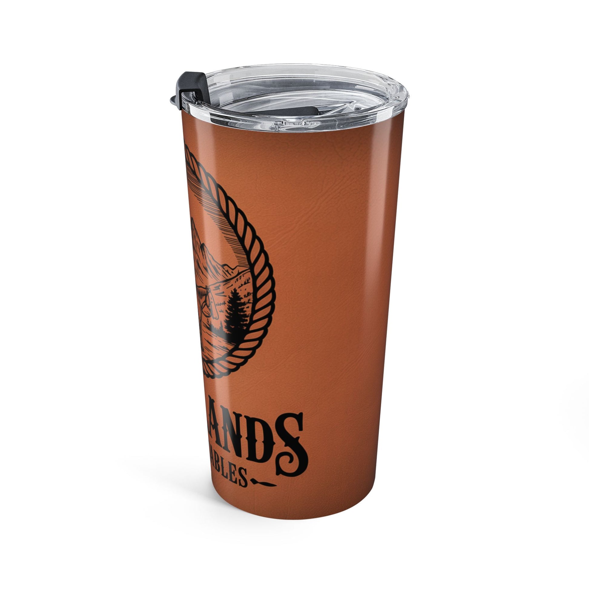 The Lone Rider Emblem tumbler from Sugarlands Riding Stables captures the serene spirit of the Smoky Mountains. With a detailed cowboy and horse illustration framed in rope and set against rich western leather tones, this design brings rustic charm and adventure to every sip. Perfect for horseback riders and Smoky Mountain enthusiasts.