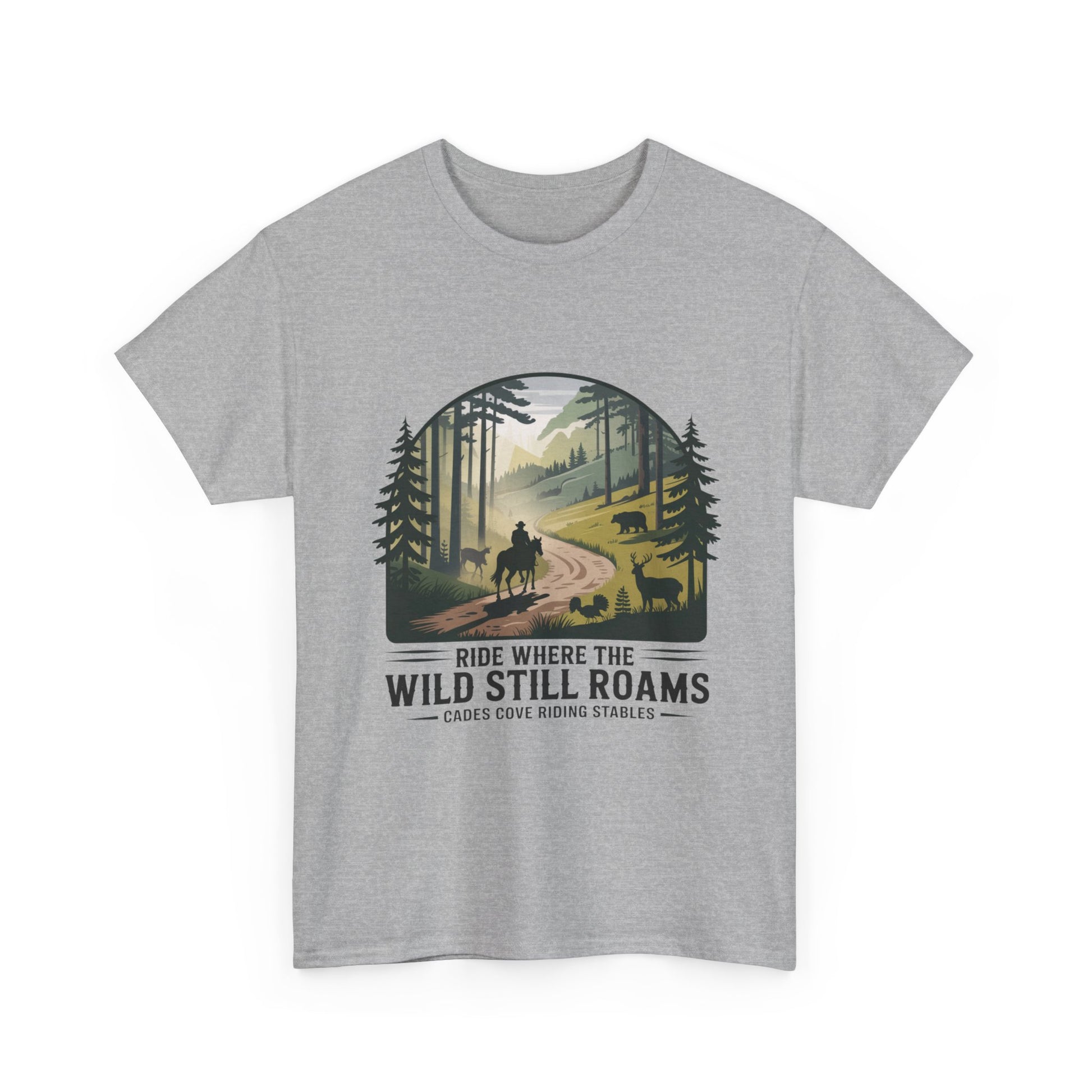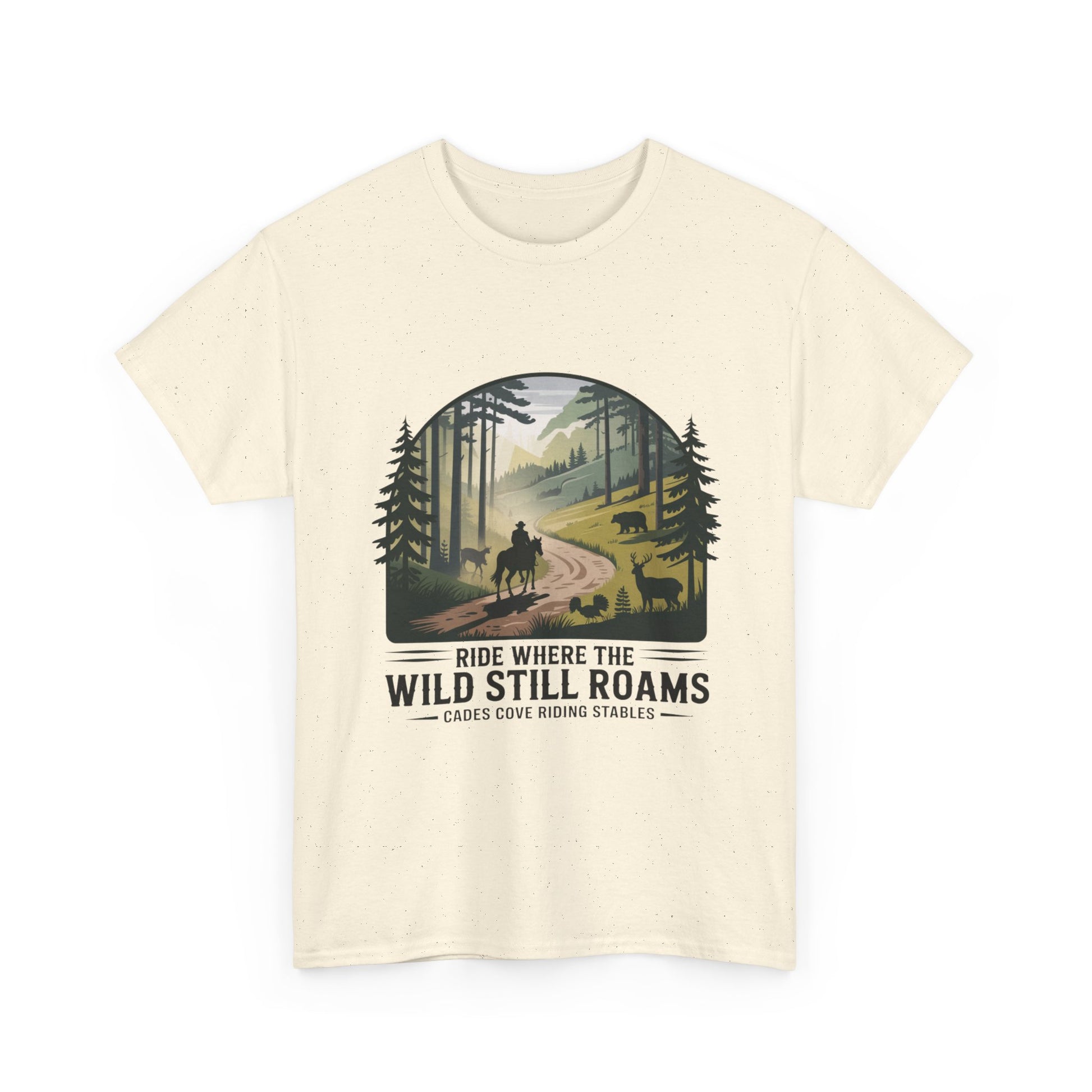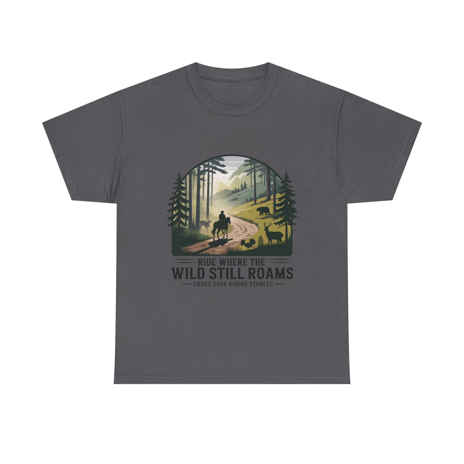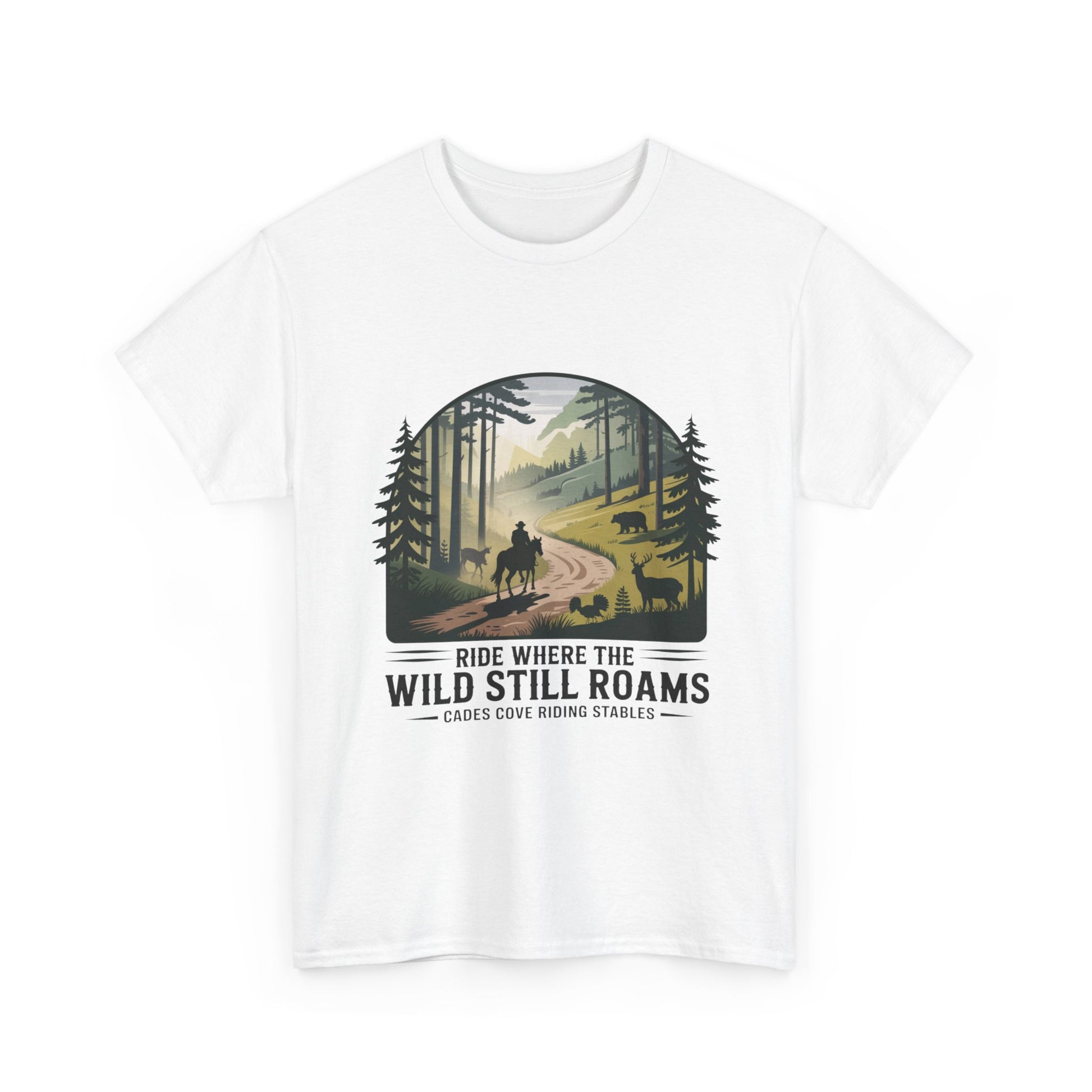 Explore the beauty of the Smoky Mountains with our Where the Wild Still Roams T-shirt from Cades Cove Riding Stables. Featuring stunning wildlife and horseback imagery, this soft, comfortable tee is perfect for nature lovers, trail riders, and park explorers. A must-have Smoky Mountains souvenir and outdoor adventure shirt.