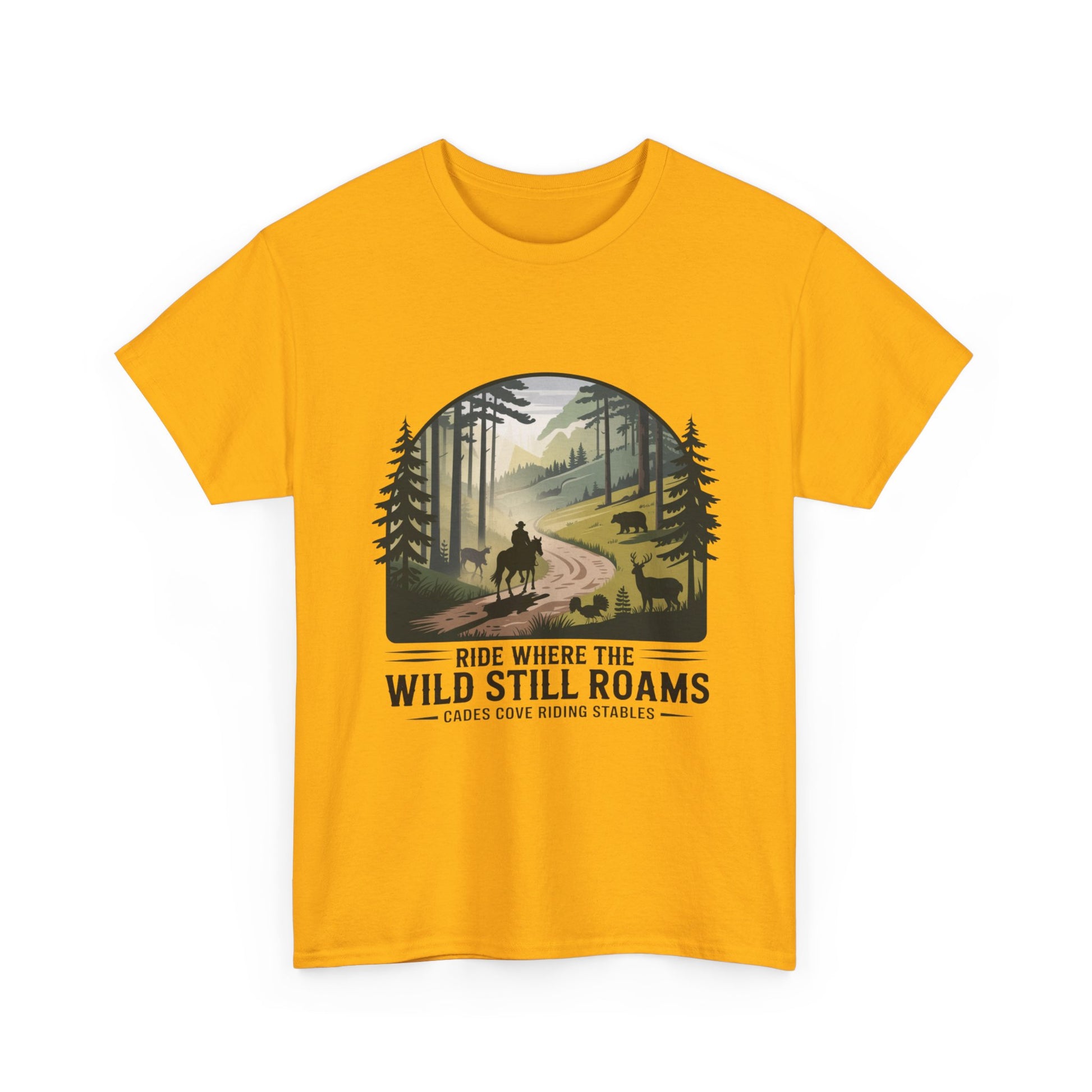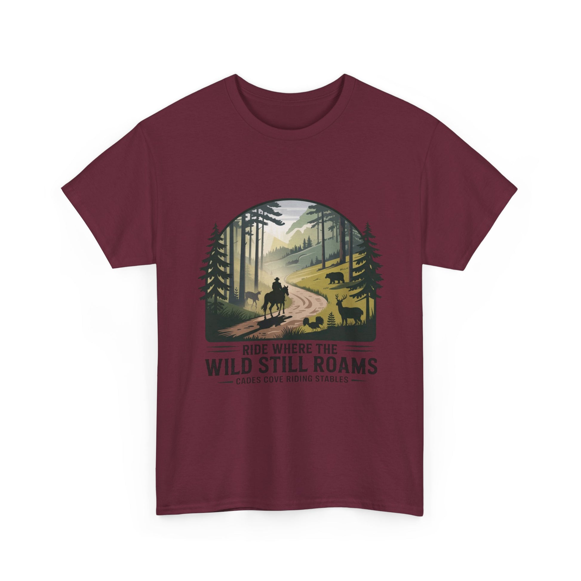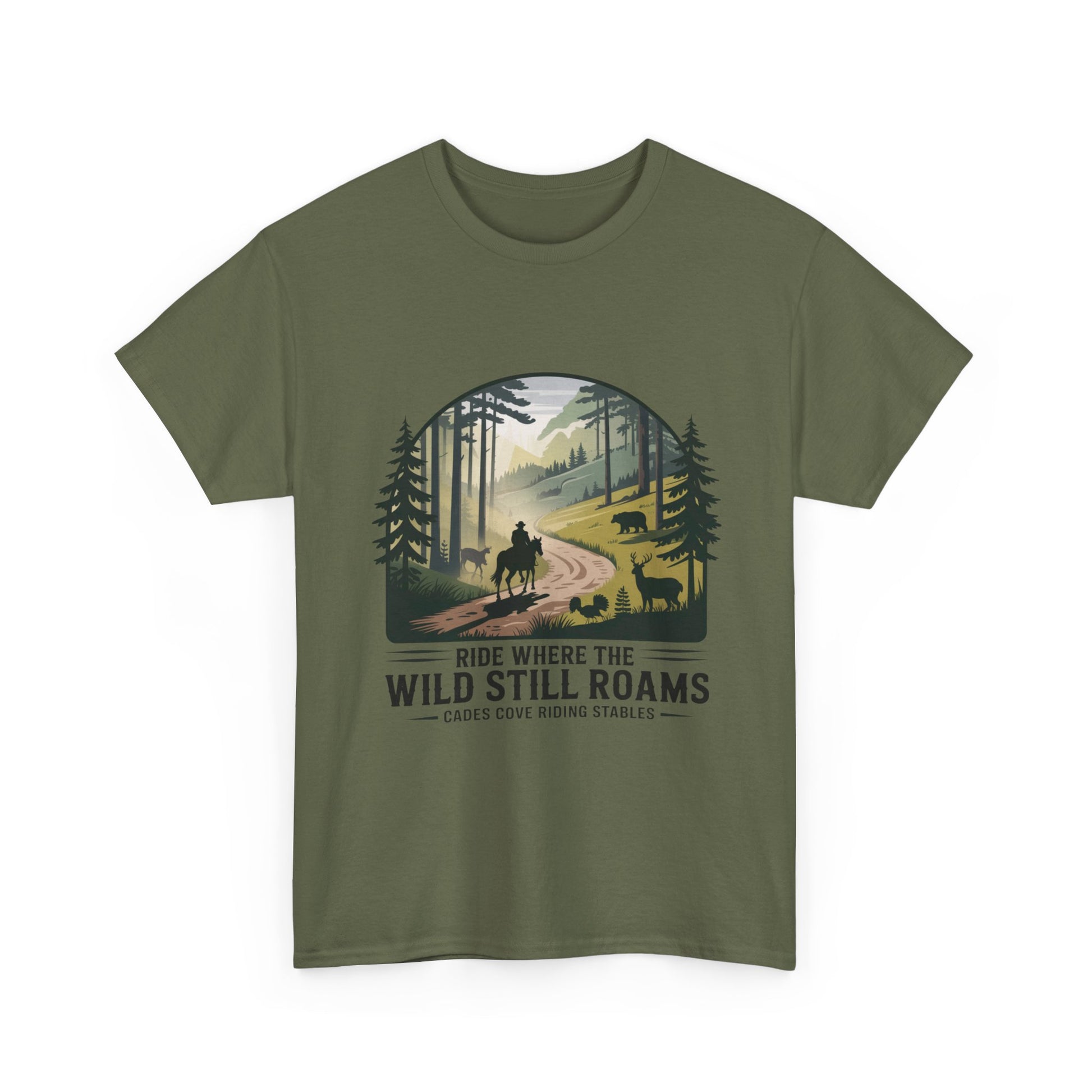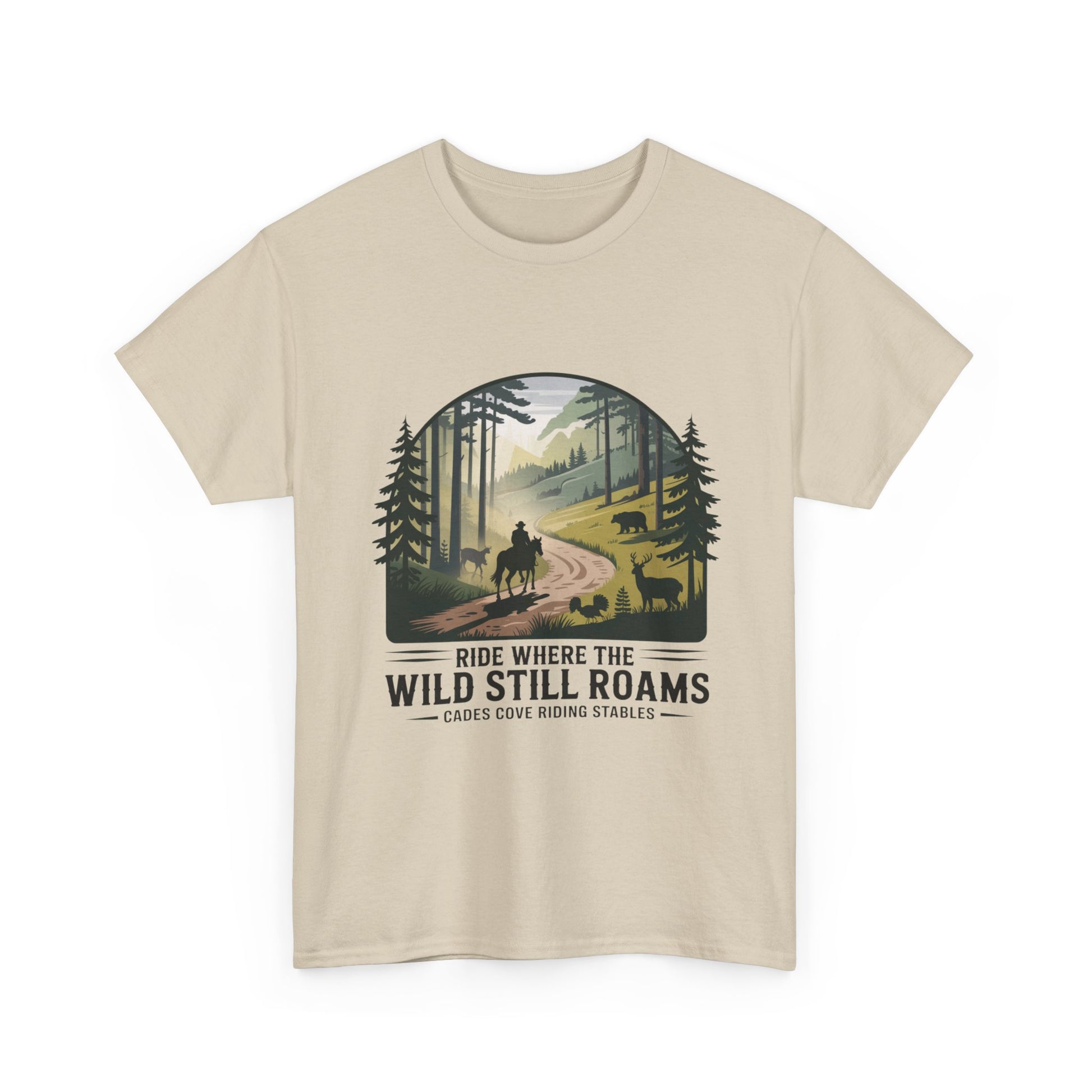 Explore the beauty of the Smoky Mountains with our Where the Wild Still Roams T-shirt from Cades Cove Riding Stables. Featuring stunning wildlife and horseback imagery, this soft, comfortable tee is perfect for nature lovers, trail riders, and park explorers. A must-have Smoky Mountains souvenir and outdoor adventure shirt.